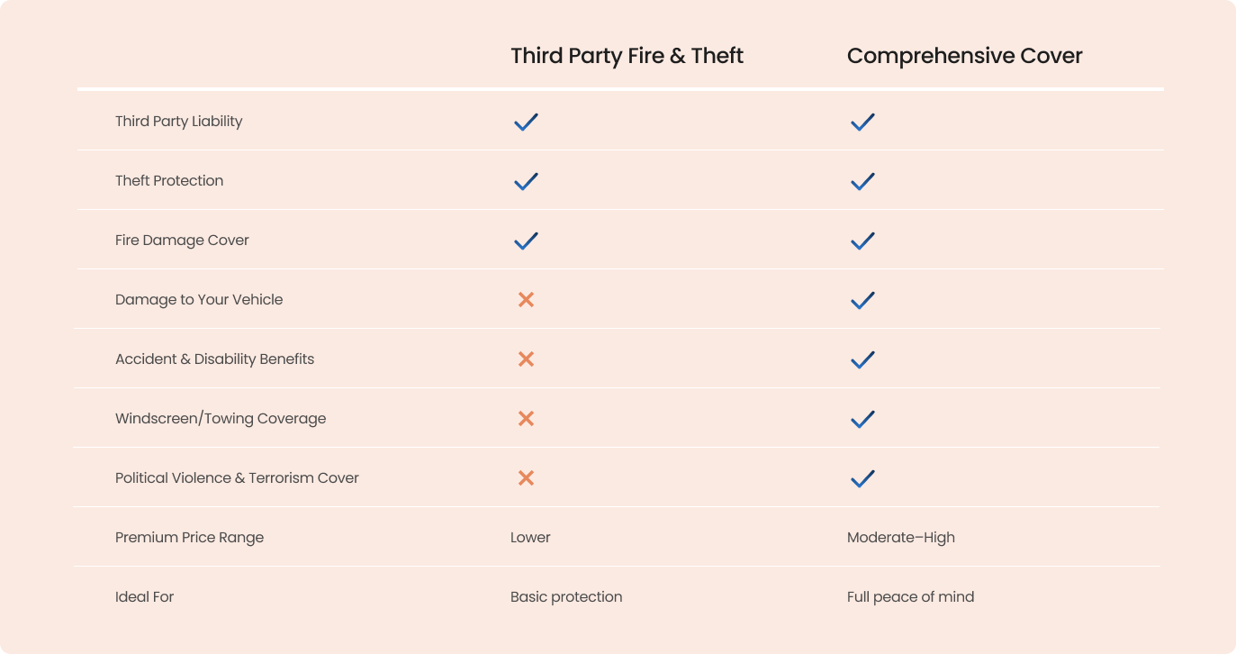 We offer two key motor insurance options—each designed to match different needs and budgets. Whether you’re looking for basic protection or complete peace of mind, we’ve got you covered.